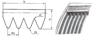 多楔帶是指以平帶為基體、內(nèi)表面排布有等間距縱向40°梯形楔的環(huán)形橡膠傳動(dòng)帶,其工作面為楔的側(cè)